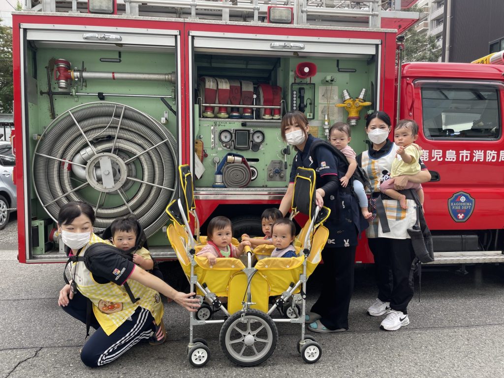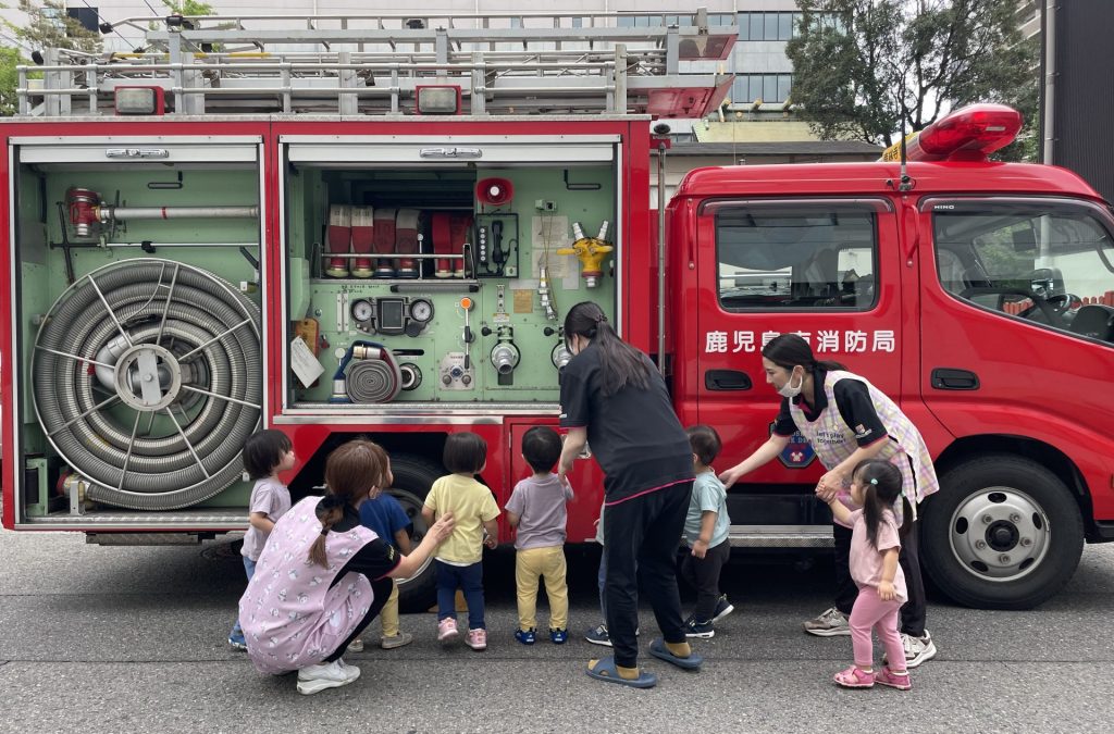 今回は消防車も来てくれて、みんなかっこいい消防車に大興奮でした!
