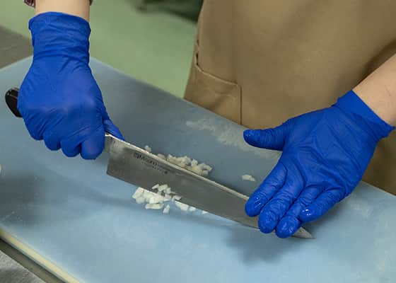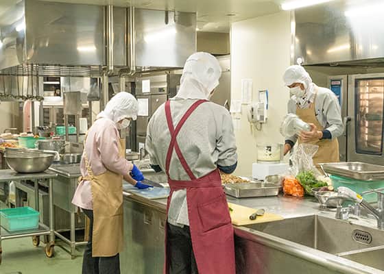 衛生管理の行き届いた相良病院の厨房で、栄養価の高い、バランスのとれた給食やおやつを作っています。